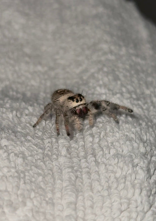 **Note: Spider pictured is mother Willow. She is a stunning "gold-phase" example of the Canopy Jumper lineage, featuring unique creamy yellow and peach tones on her abdomen with a prominent charcoal shield pattern. She is best known for her vivid, high-contrast red-orange chelicerae (fangs) and her distinct white 'mustache.' As this was a surprise clutch, we are excited to offer these healthy, captive-bred babies. We cannot guarantee the final colors of an adult as they can change with each molt, and they don't always look exactly like mom. You will get one of our available babies.